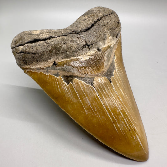 Colorful, sharply serrated 4.80" Fossil Megalodon Tooth from North Carolina