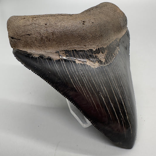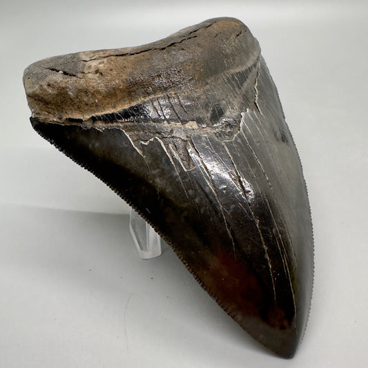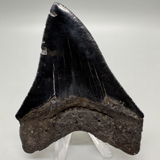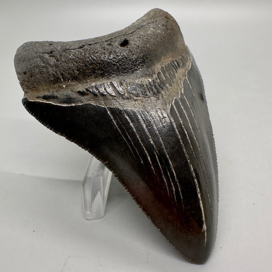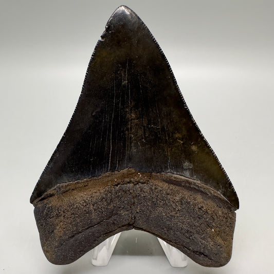 Jet Black, sharply serrated 4.36" Fossil Megalodon Tooth from Georgia